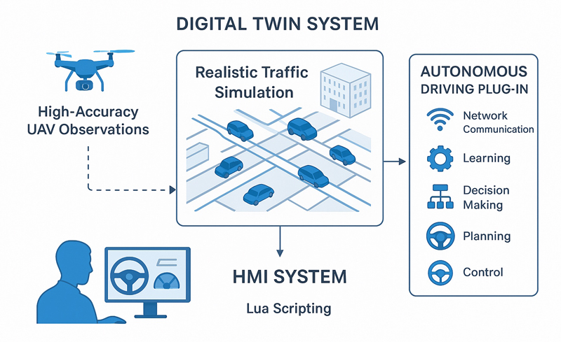 This research leverages UC-win/Road as a simulation platform, integrating autonomous driving and Human-Machine Interface (HMI) technologies for the development of a digital twin system. High-fidelity Unmanned Aerial Vehicle observation data facilitates realistic traffic flow simulation. Scene fidelity is enhanced by integrating road-specific Building Information Models (BIM) and satellite imagery. Furthermore, autonomous driving plugins enabling networked communication, learning, decision-making, planning, and control were developed, alongside a LUA-scripted HMI system, constituting a next-generation digital twin framework.
